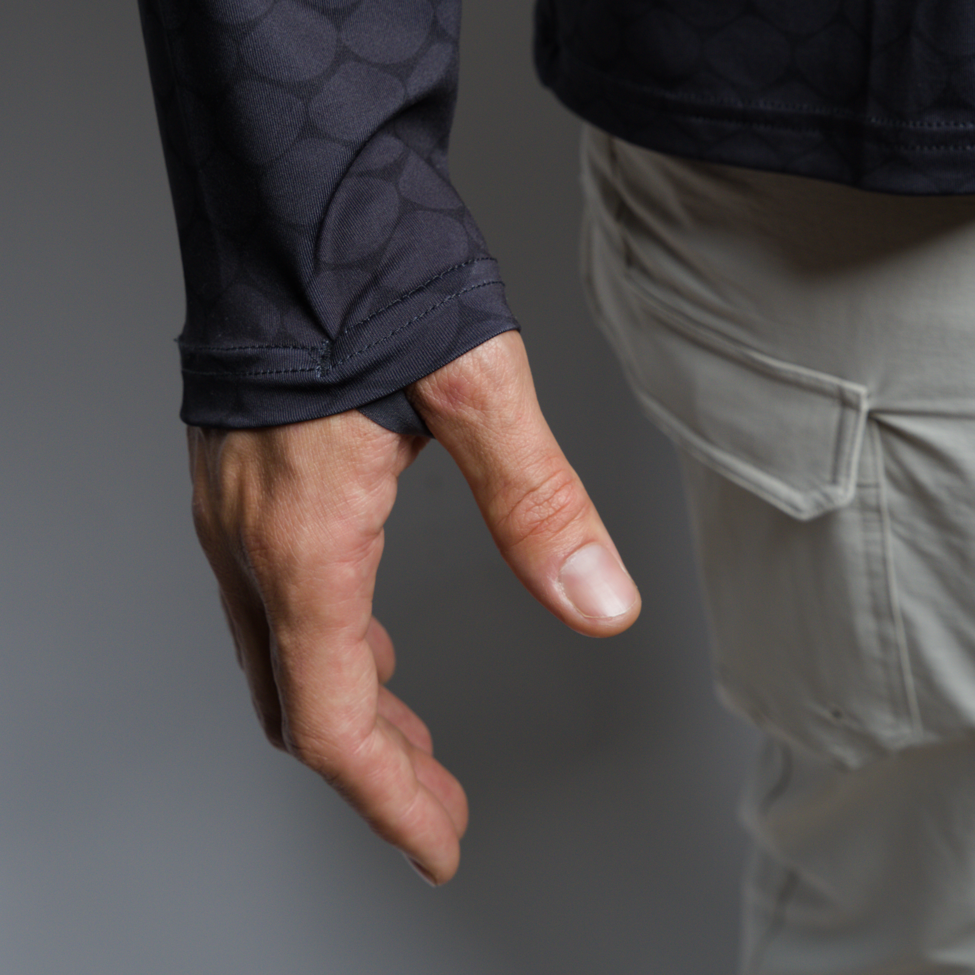 🧤 Thumb Strap Sleeves — Keeps sleeves positioned and arms protected while fishing